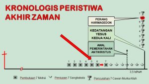 Garis panjang merupakan garis waktu, sedangkan tanda merah setelah salib merupakan tanda waktu yang panjang sebelum peristiwa-peristiwa akhir zaman terjadi. Peristiwa pertama adalah awal pemerintahan Antikris selama 3,5 tahun, kemudian disusul dengan kedatangan Yesus. Namun sebelum peristiwa kedatangan Yesus terjadi, ada tanda-tanda berupa pembukaan meterai, peniupan sangkakala. Sangkakala ke 4 ditiup persis ketika Antikris menyatakan diri. Sangkakala ke-7 ditiup tepat selama masa pemerintahan Antikristus. Setelah Yesus datang, orang-orang yang masih hidup akan diubahkan, dan orang-orang yang mati akan dibangkitkan. Inilah yang disebut pengangkatan (repture). Setelah itu, barulah cawan murka Allah ditumpahkan, dari cawan 1-6. Sebelum cawan ke-7 dicurahkan, maka akan terjadi perang Harmagedon.